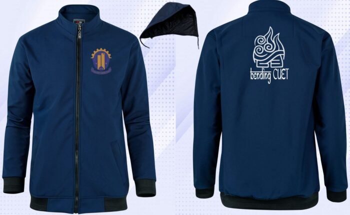 bending CUET থিমের এই জ্যাকেটের পেছনের এই ডিজাইনটি Avater the Last Airbender সিরিজের Airbender, Waterbender, Firebender & Earthbender এর সাইন মিশ্রণ করে তৈরি করা।